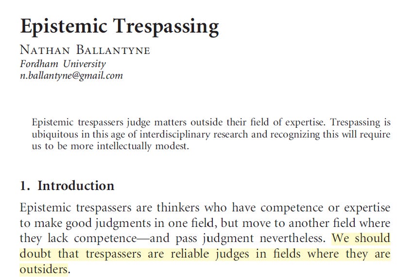 I am interested in your point about “epistemic trespassing”. As a retired doctor with a strong interest in bioethics, I’m deeply concerned about the practice of paediatric gender medicine. I’m obviously not an “expert” but I have read The Cass Review and The HHS Review, along with bioethics literature from both sides of the gender debate.