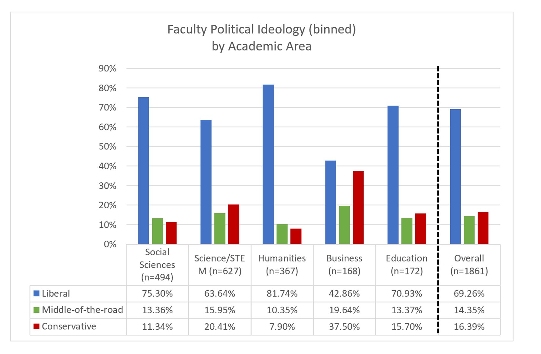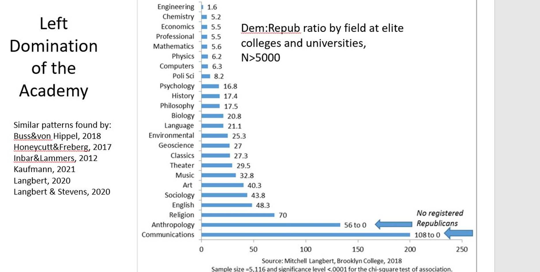 HERI data, however, has some odd characteristics. Thirty percent of the institutions it surveys are religious – and no one doubts that religious institutions skew more conservative than the rest of academia. It also does not focus on the prestigious and elite colleges and universities that are at the vanguard of sociocultural and political influences on the wider society. Research conducted at such places paints a far more extreme picture. For example, Langbert (2018) found a vastly more extreme skew in elite liberal arts colleges: