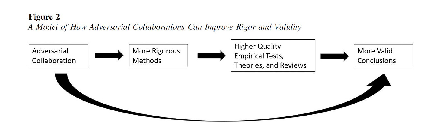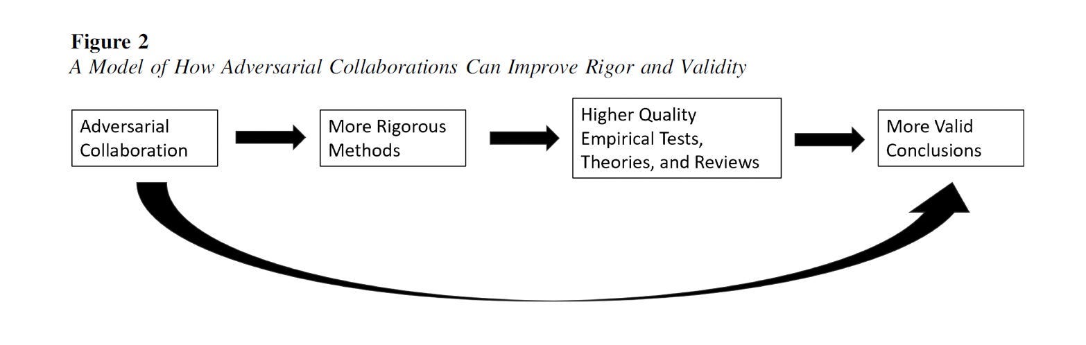 The process of strong inference – testing alternate hypotheses and designing experiments to exclude one or more and iterate on the survivors – is arguably the clearest and most efficient way to produce scientific advances. Typically, the alternative ideas necessary for strong inference emerge from different scientists who have different ideas about the nature of some phenomenon — this is viewpoint diversity. Furthermore, adversarial collaborations – research collaborations between scientists who have staked out opposing views on some phenomenon (viewpoint diversity rides again!) – are most likely to encourage strong inference. Opponents will be highly motivated to subject one another’s claims to severe tests – empirical tests likely to falsify some hypothesis if that hypothesis is actually false. As such, adversarial collaborations can provide an important check on the type of confirmation biases that can so often be found in peer reviewed literatures.