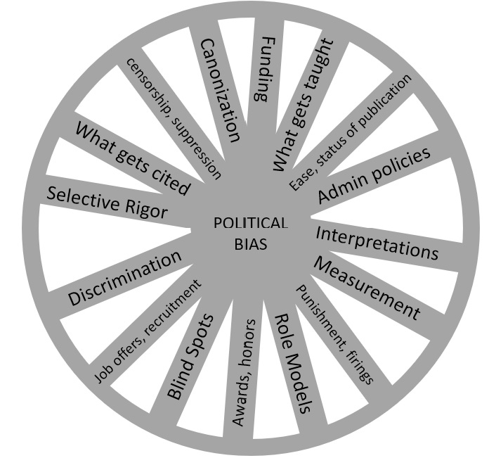 Thus, when we use the term “political bias,” we rarely refer to characteristics of individual researchers. Instead, we use the term “political bias” to characterize scientific literature that systematically and erroneously canonizes and emphasizes dubious or false left-affirming claims and/or systematically fails to recognize evidence and rigorous conceptual and statistical analysis that contests those claims